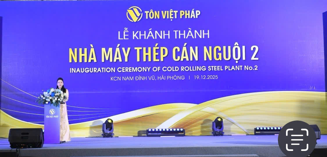 Thay mặt Ban Lãnh đạo Công ty, Chủ tịch HĐQT Mai Minh Nguyệt gửi tới Quý vị đại biểu, Quý khách quý lời chào trân trọng, lời cảm ơn chân thành và những lời chúc tốt đẹp nhất. Việc hoàn thành và đưa vào vận hành Nhà máy Thép Cán Nguội 2 là dấu mốc có ý nghĩa đặc biệt quan trọng, thể hiện tầm nhìn chiến lược, sự quyết tâm và nỗ lực không ngừng của tập thể Tôn Thép Việt Pháp trong hành trình phát triển bền vững và nhấn mạnh “Nhà máy thép cán nguội 2 được đầu tư đồng bộ về công nghệ, thiết bị hiện đại, đáp ứng các tiêu chuẩn cao về chất lượng và môi trường, hướng tới mục tiêu cung cấp những sản phẩm thép cán nguội chất lượng cao cho thị trường trong nước và quốc tế”. Thành công của dự án hôm nay là kết quả của sự quan tâm, hỗ trợ quý báu từ các cơ quan quản lý Nhà nước, chính quyền địa phương, Ban Quản lý Khu kinh tế Hải Phòng; sự đồng hành tin cậy của các đối tác, khách hàng; cùng với tinh thần đoàn kết, trách nhiệm và cống hiến của toàn thể cán bộ, công nhân viên Công ty. Trong giai đoạn phát triển mới, Tôn Thép Việt Pháp cam kết tiếp tục đổi mới công nghệ, nâng cao chất lượng sản phẩm, phát triển theo hướng xanh – bền vững, đóng góp tích cực vào sự phát triển kinh tế – xã hội của thành phố Hải Phòng và ngành công nghiệp thép Việt Nam.